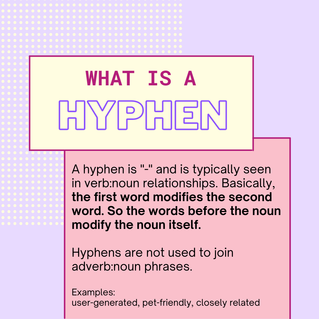 A hyphen is “-” and is typically seen in adjective–noun relationships. Basically, the first word modifies the second word. Words before the noun modify the noun itself. Hyphens are not used to join adverb–noun phrases.