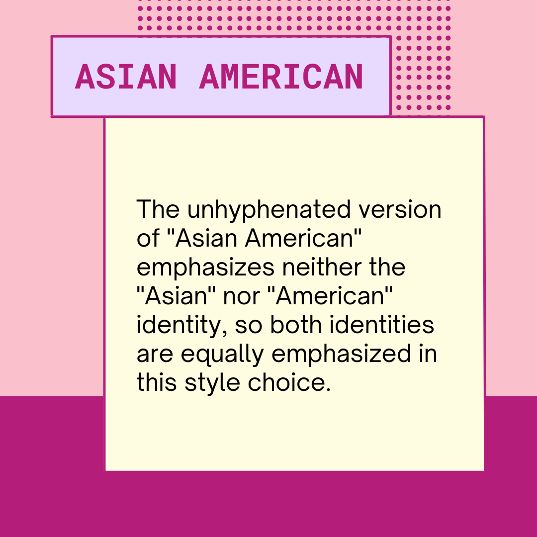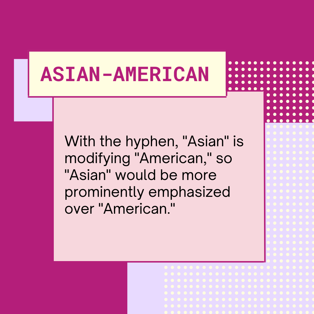 Note: The second version (“Asian-American”) is hyphenated; the first (“Asian American”) is not.