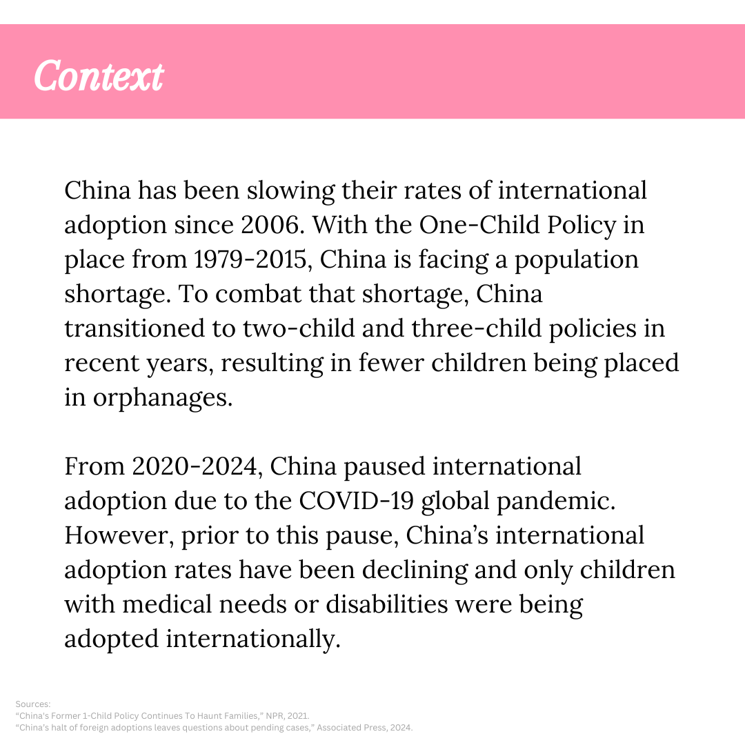 From 2020 to 2024, China paused international adoption due to the COVID-19 global pandemic. Even before this pause, international adoption rates were declining, with most children placed internationally having medical needs or disabilities.