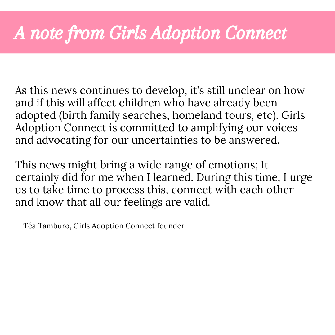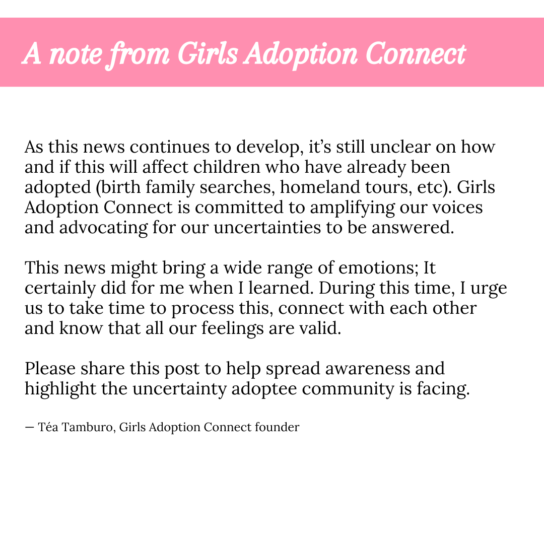 As this news continues to unfold, it remains unclear how — or if — it will impact adoptees who have already been adopted, including birth family searches, homeland tours, and related services. Girls Adoption Connect remains committed to amplifying adoptee voices and advocating for clarity and accountability.