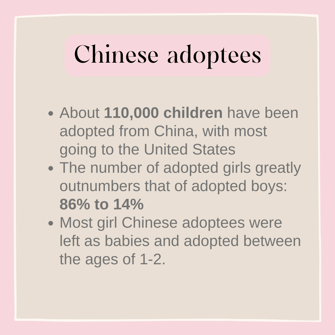 Most Chinese girl adoptees were left as babies and adopted between the ages of one and two.
