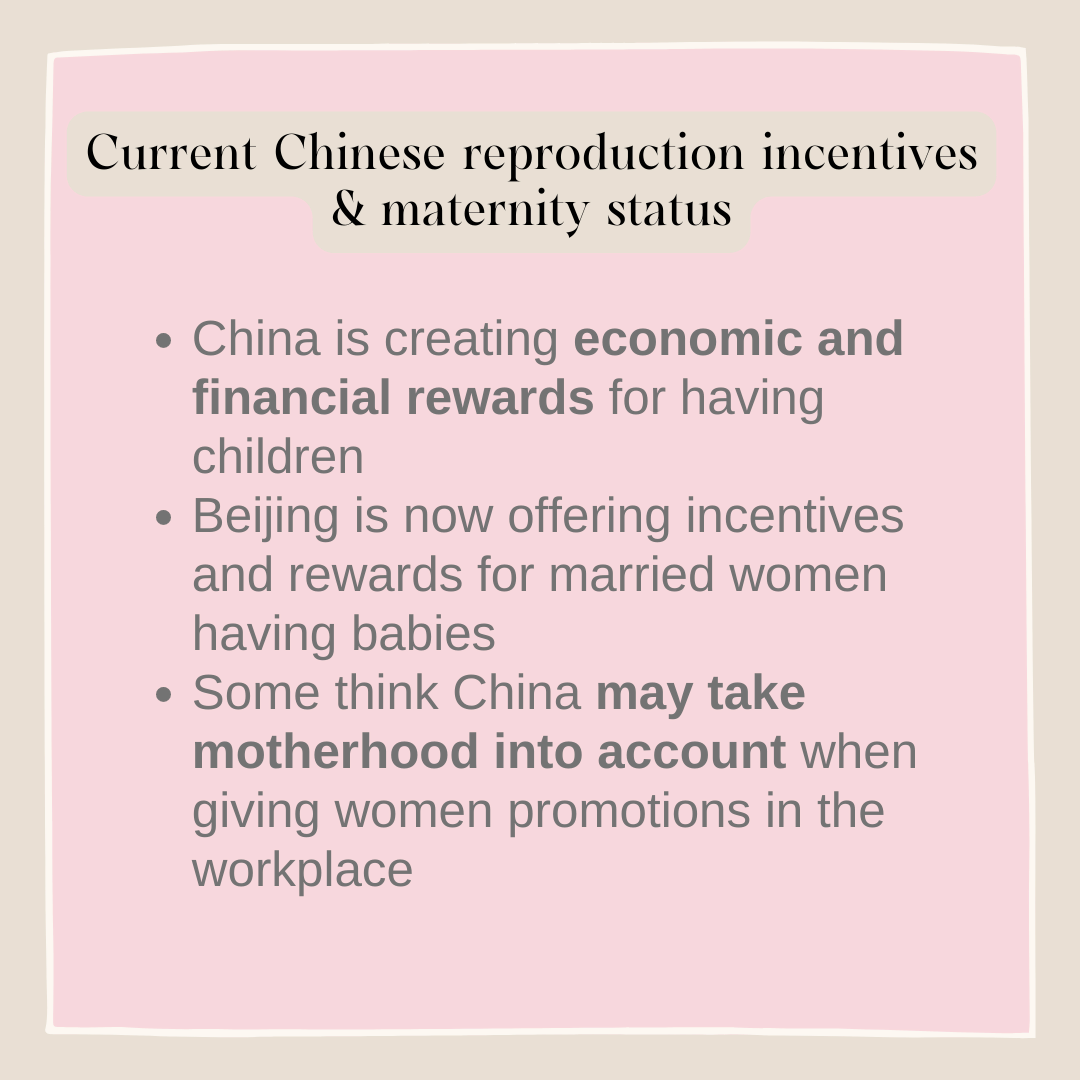 Some believe China may begin factoring motherhood into workplace promotions for women.