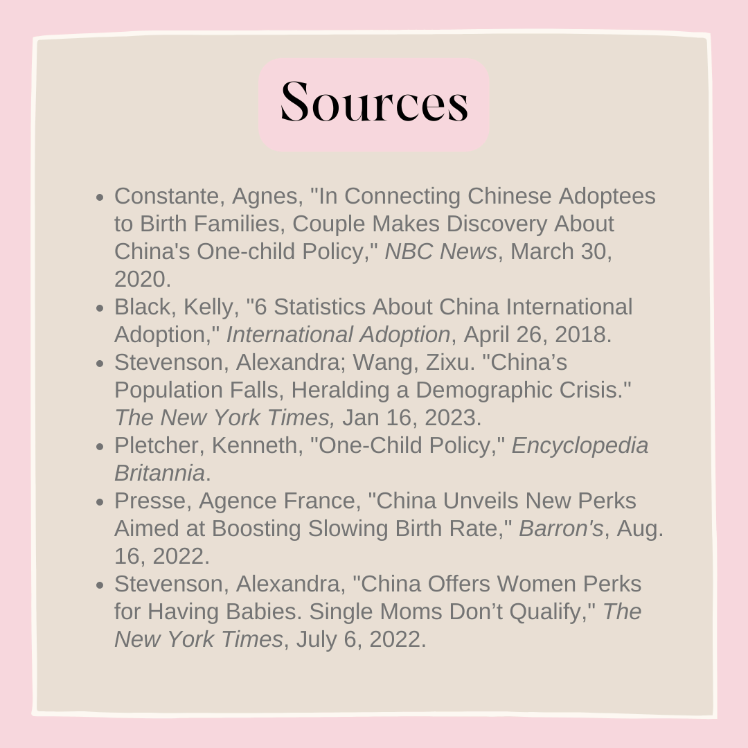 Pletcher, Kenneth. “One-Child Policy.” Encyclopedia Britannica.