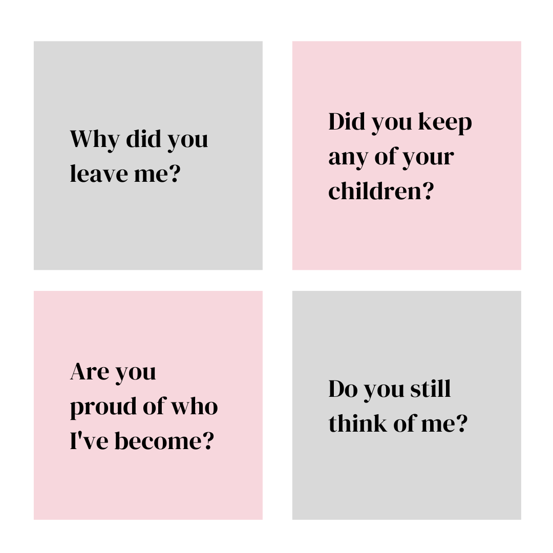 Slide two: Why did you leave me? Did you keep any of your children? Are you proud of who I've become? Do you still think of me?