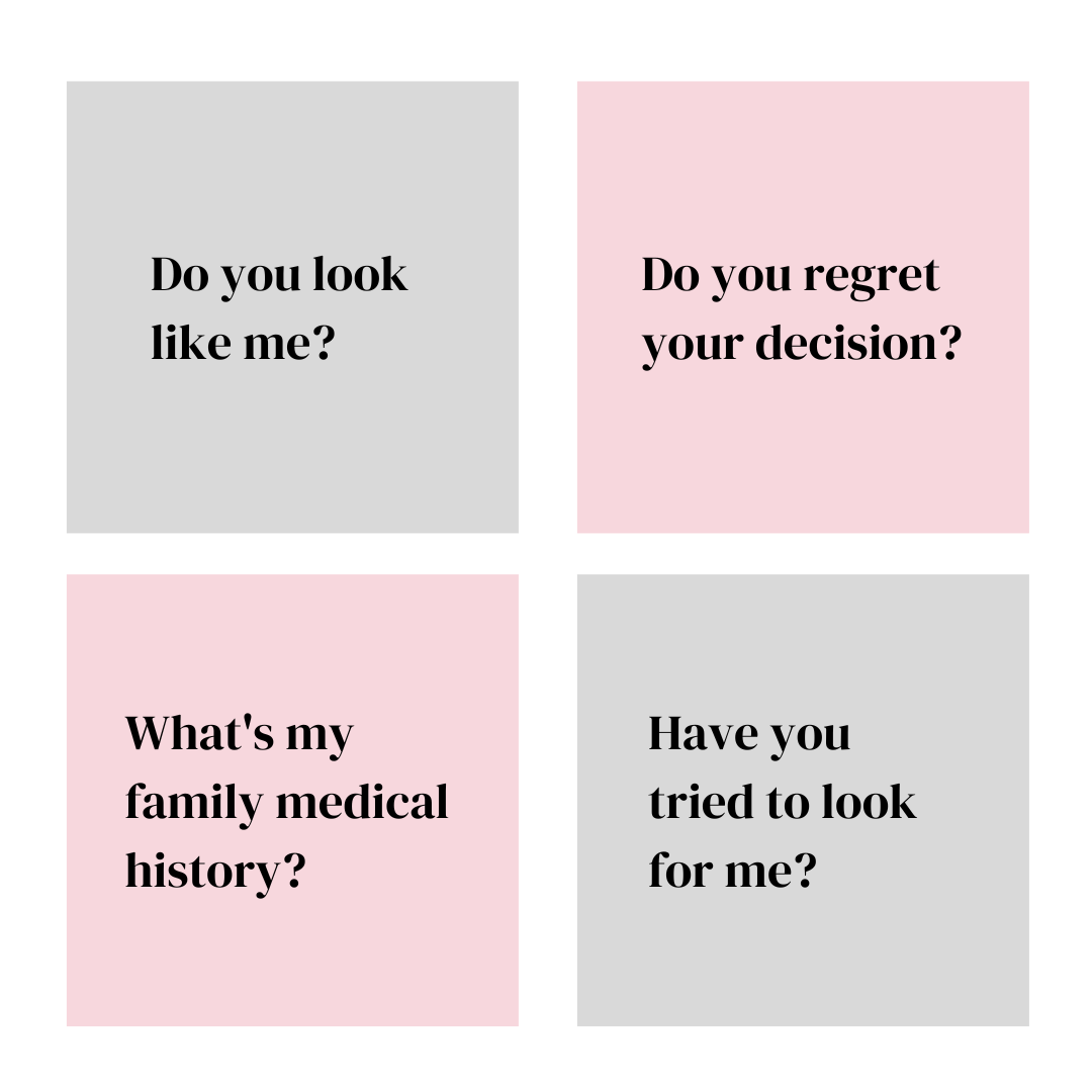 Slide four: Do you look like me? Do you regret your decision? What's my family medical history? Have you tried to look for me?