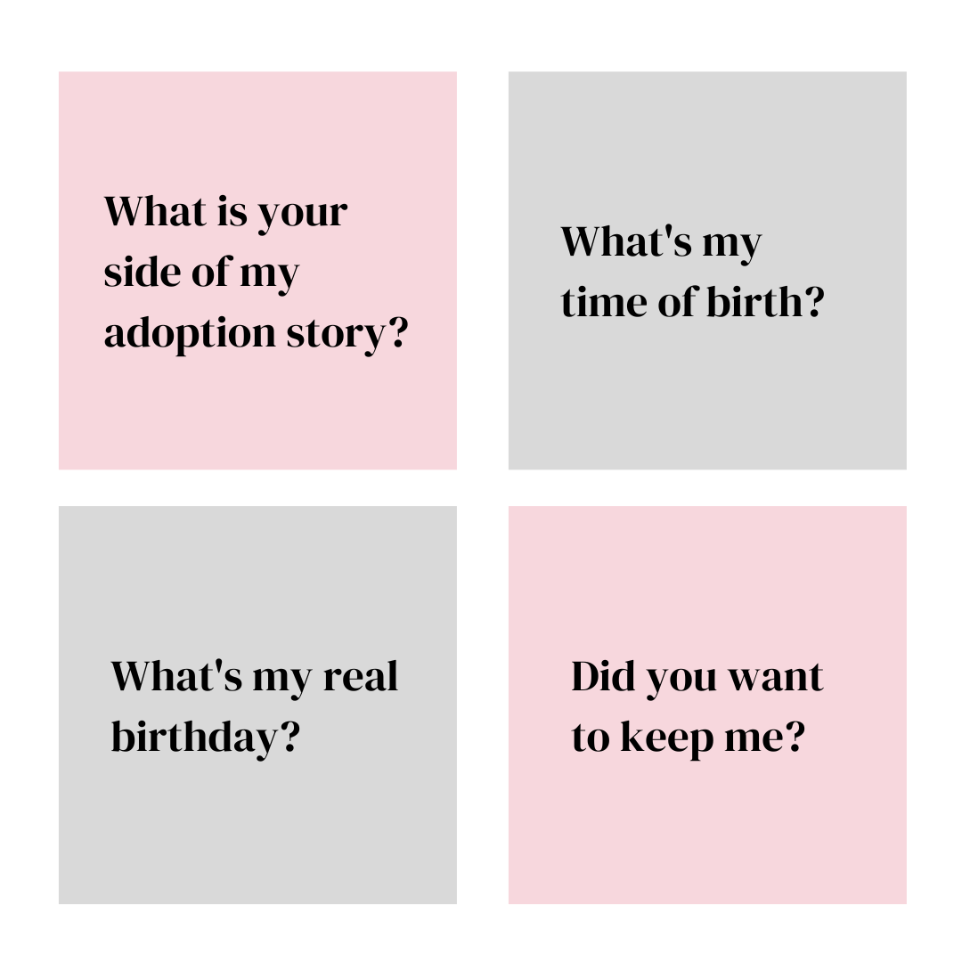 Slide three: What were you going to name me? Did you have a name for me? Do I have biological siblings? Was the decision to put me up for adoption hard for you?