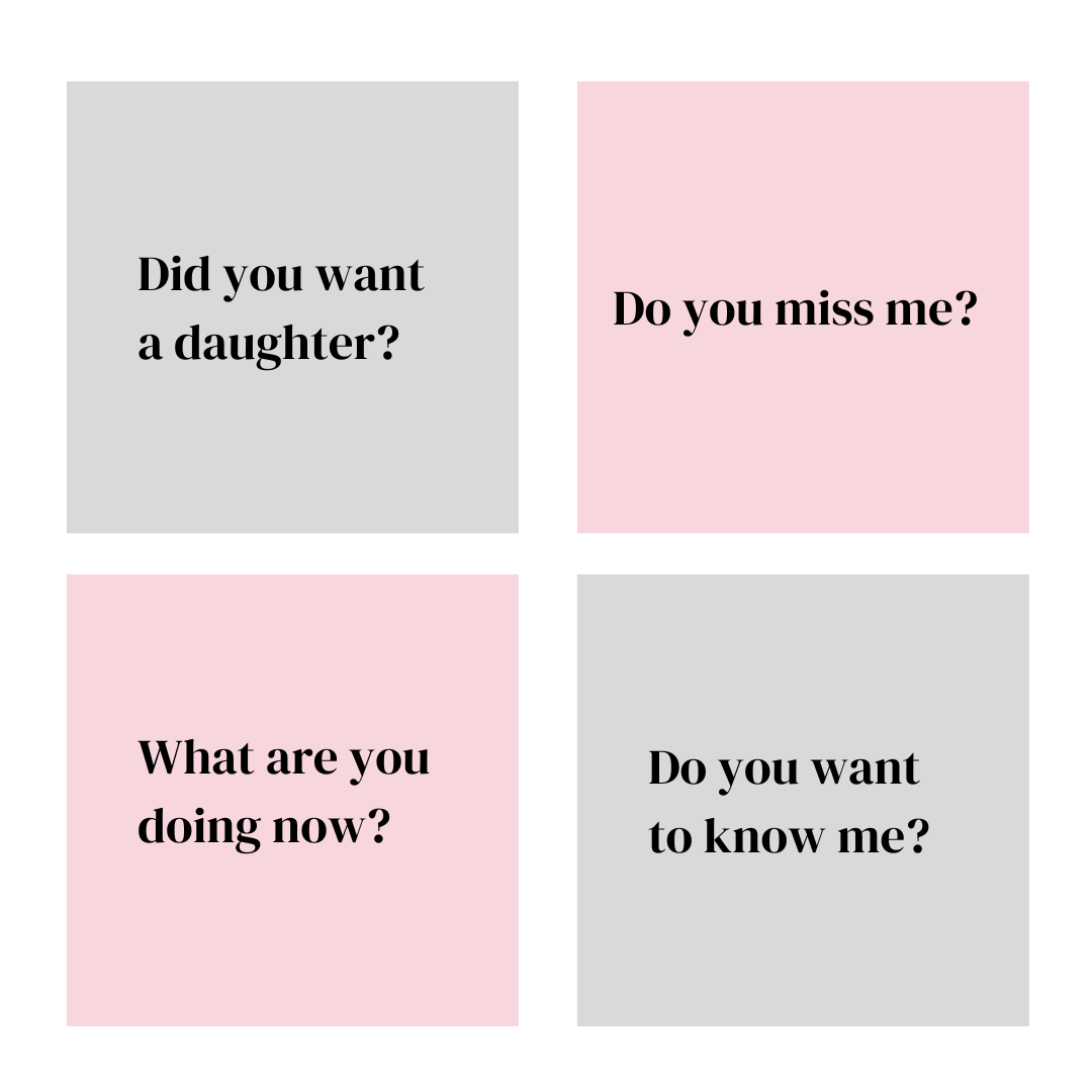 Slide six: Did you want a daughter? Do you miss me? What are you doing now? Do you want to know me?