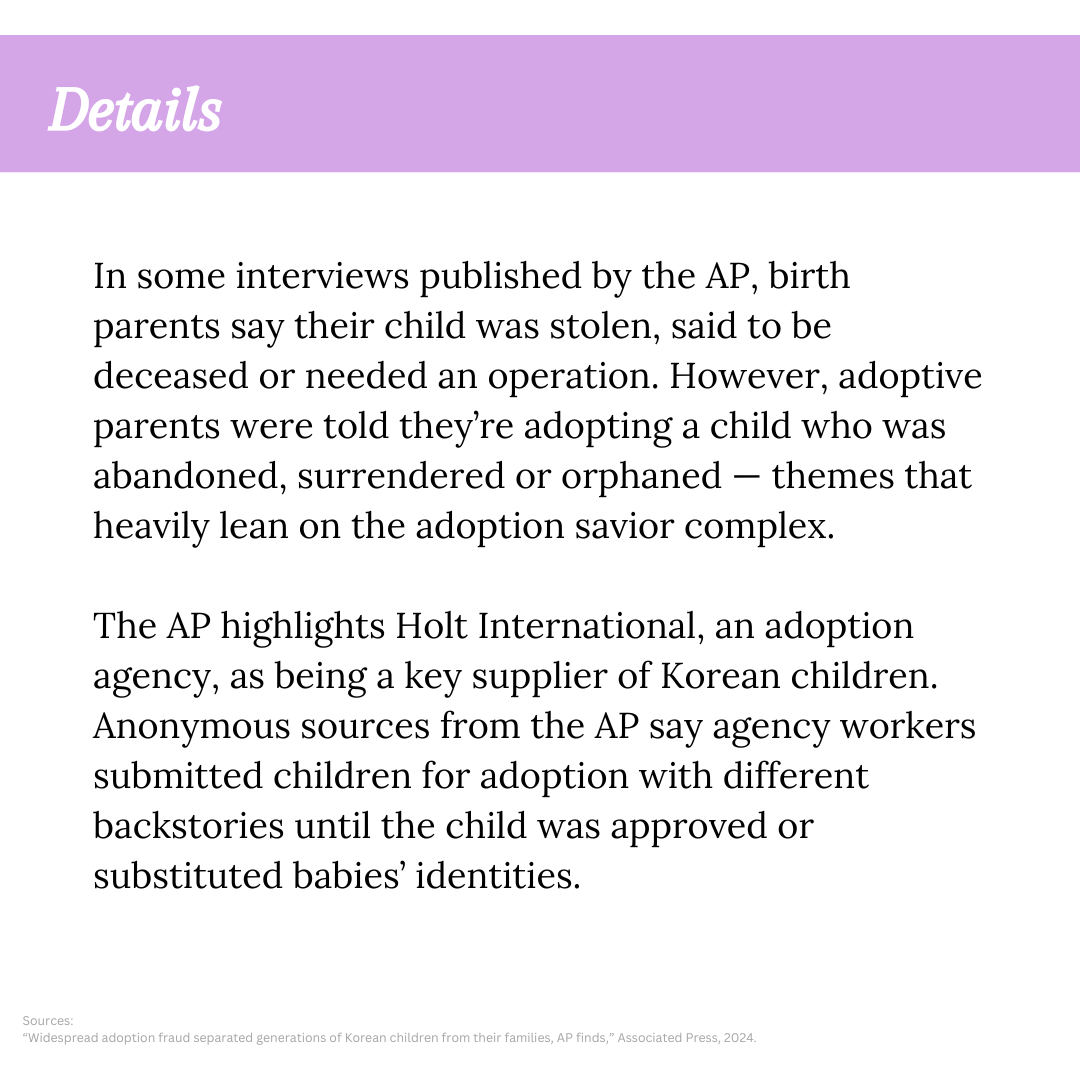 In interviews published by the AP, some birth parents say they were told their child had died, been stolen, or needed medical treatment. Meanwhile, adoptive parents were told they were adopting children who had been abandoned, surrendered, or orphaned — narratives that heavily reinforce the adoption savior complex.