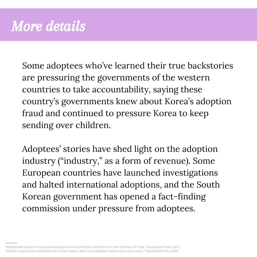 - Western nations were desperate for Korean babies. Now many adoptees believe they were stolen,” Associated Press, 2024.