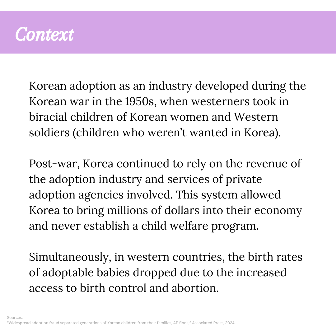 After the war, Korea continued relying on the adoption industry and private agencies as a source of revenue, never fully establishing a national child welfare system. At the same time, Western countries experienced declining numbers of adoptable infants due to increased access to birth control and abortion. -