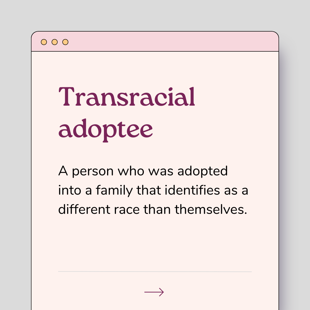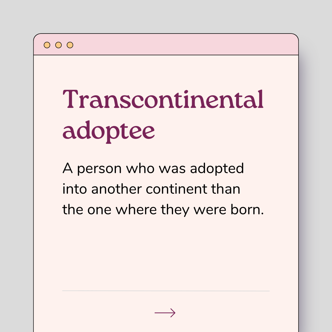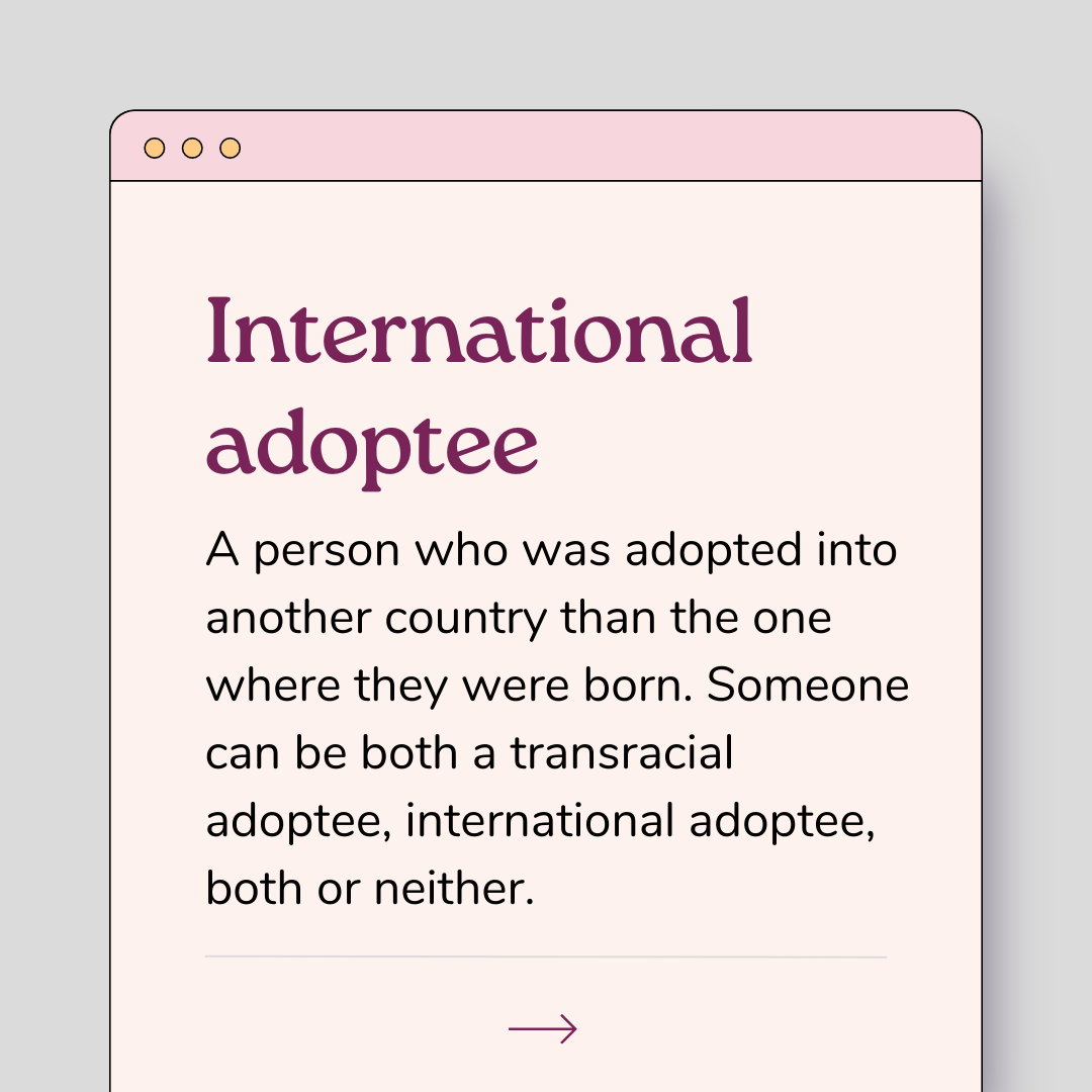 A person who was adopted into a country different from the one where they were born. Someone can be a transracial adoptee, an international adoptee, both, or neither.