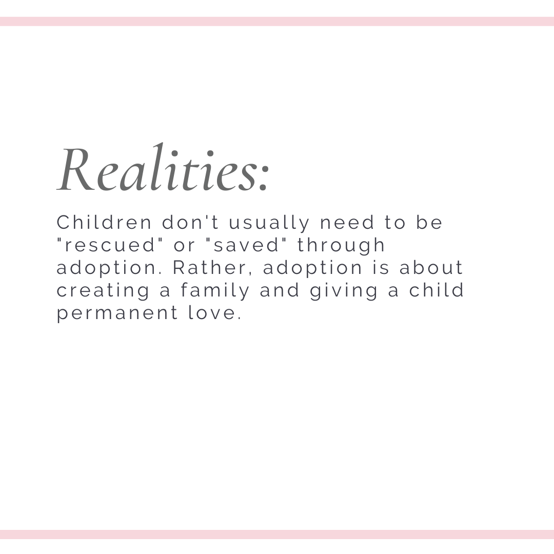 Children don’t usually need to be “rescued” or “saved” through adoption. Rather, adoption is about creating a family and giving a child permanent love.