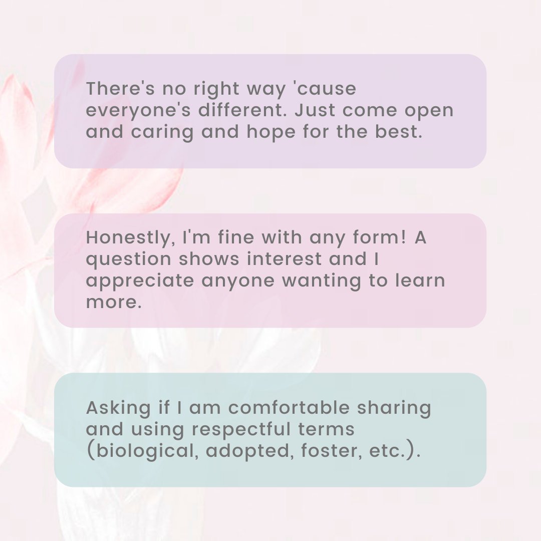 - Slide two: Pale pink floral background. Three boxes of translucent color. Purple box: “There's no right way 'cause everyone's different. Just come open and caring and hope for the best.” Magenta box: “Honestly, I'm fine with any form! A question shows interest and I appreciate anyone wanting to learn more.” Green box: “Asking if I am comfortable sharing and using respectful terms (biological, adopted, foster, etc.).”