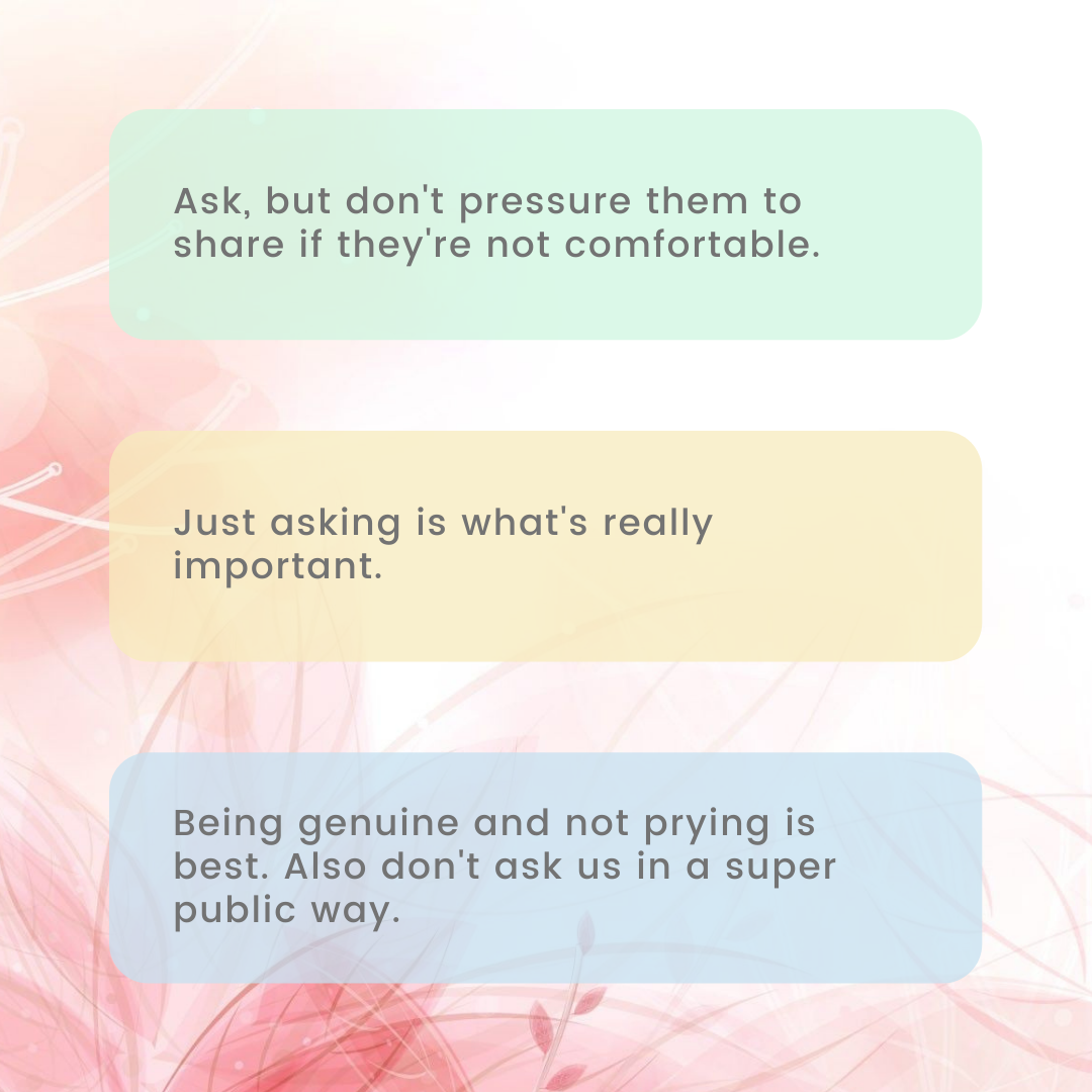 - Slide three: Pale pink floral background with a few darker pink flowers. Three boxes of translucent color. Bright green box: “Ask, but don't pressure them to share if they're not comfortable.” Yellow box: “Just asking is what's really important.” Blue box: “Being genuine and not prying is best. Also don't ask us in a super public way.”