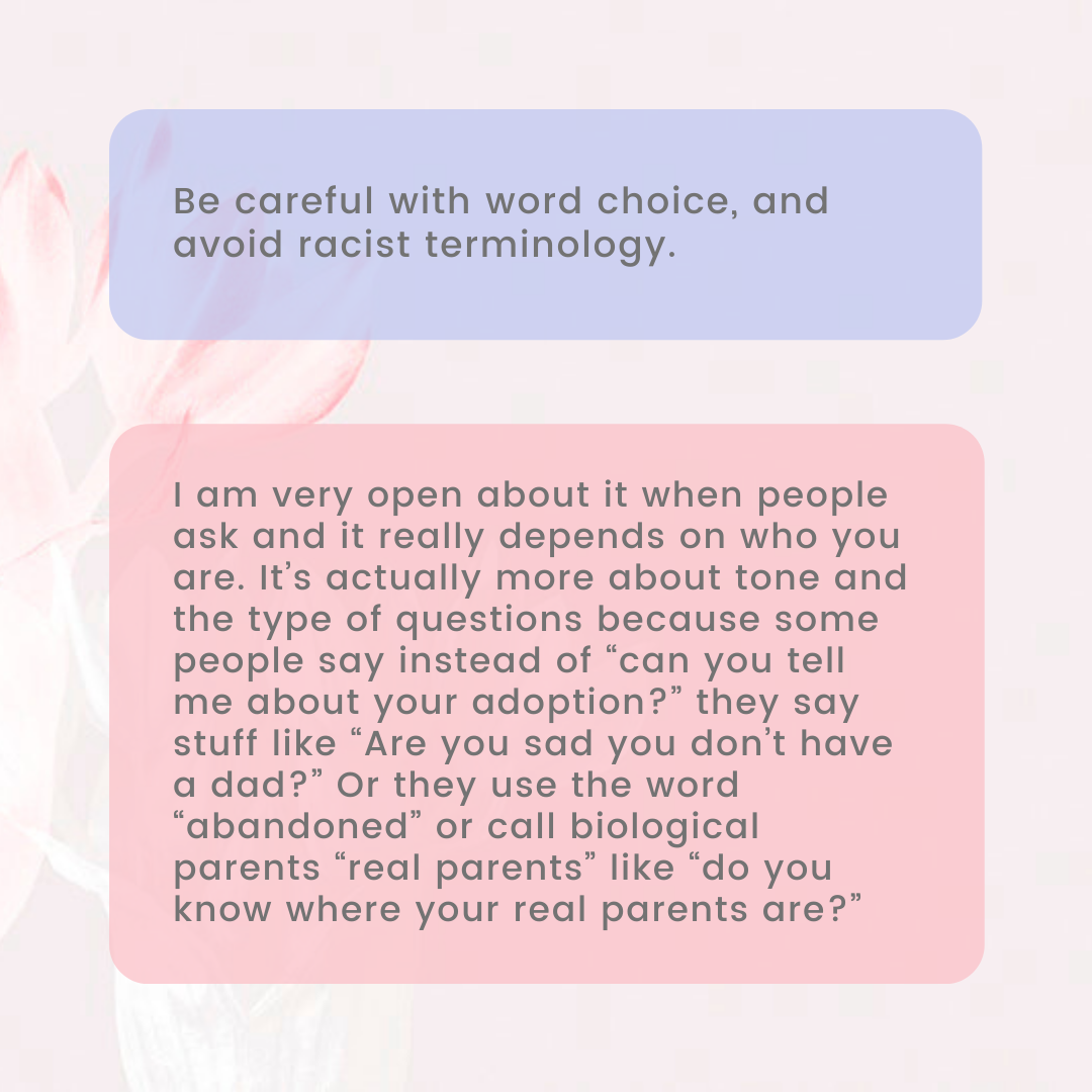 - Slide four: Pale pink floral background. Three boxes of translucent color. Blue box: “Be careful with word choice, and avoid racist terminology.” Red box: "I am very open about it when people ask and it really depends on who you are. It’s actually more about tone and the type of questions because some people say instead of “can you tell me about your adoption?” they say stuff like “Are you sad you don’t have a dad?” Or they use the word “abandoned” or call biological parents “real parents” like “do you know where your real parents are?”