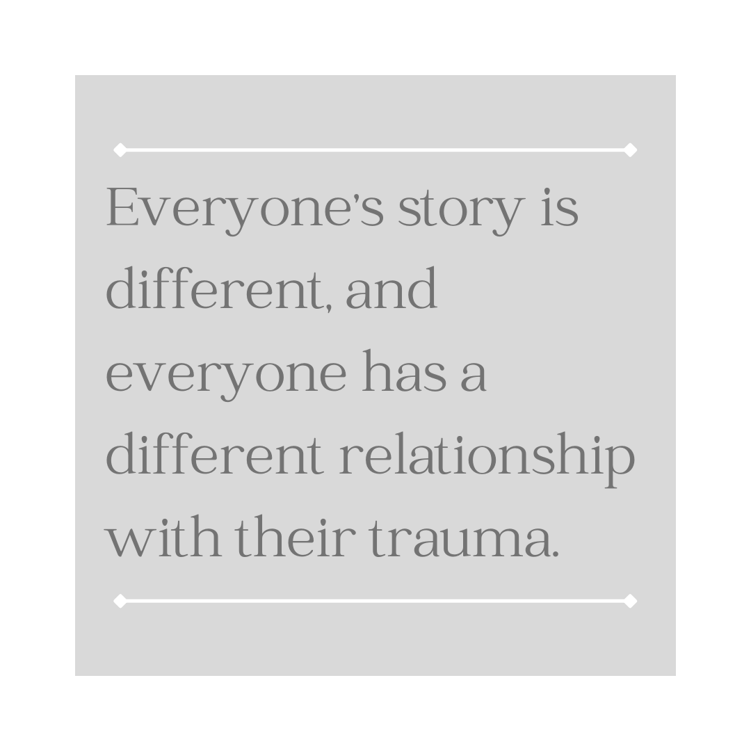 Slide two: White background with a light gray square box. Gray text reads âEveryone's story is different, and everyone has a different relationship with their trauma.â Two white decorative lines appear above and below the text.