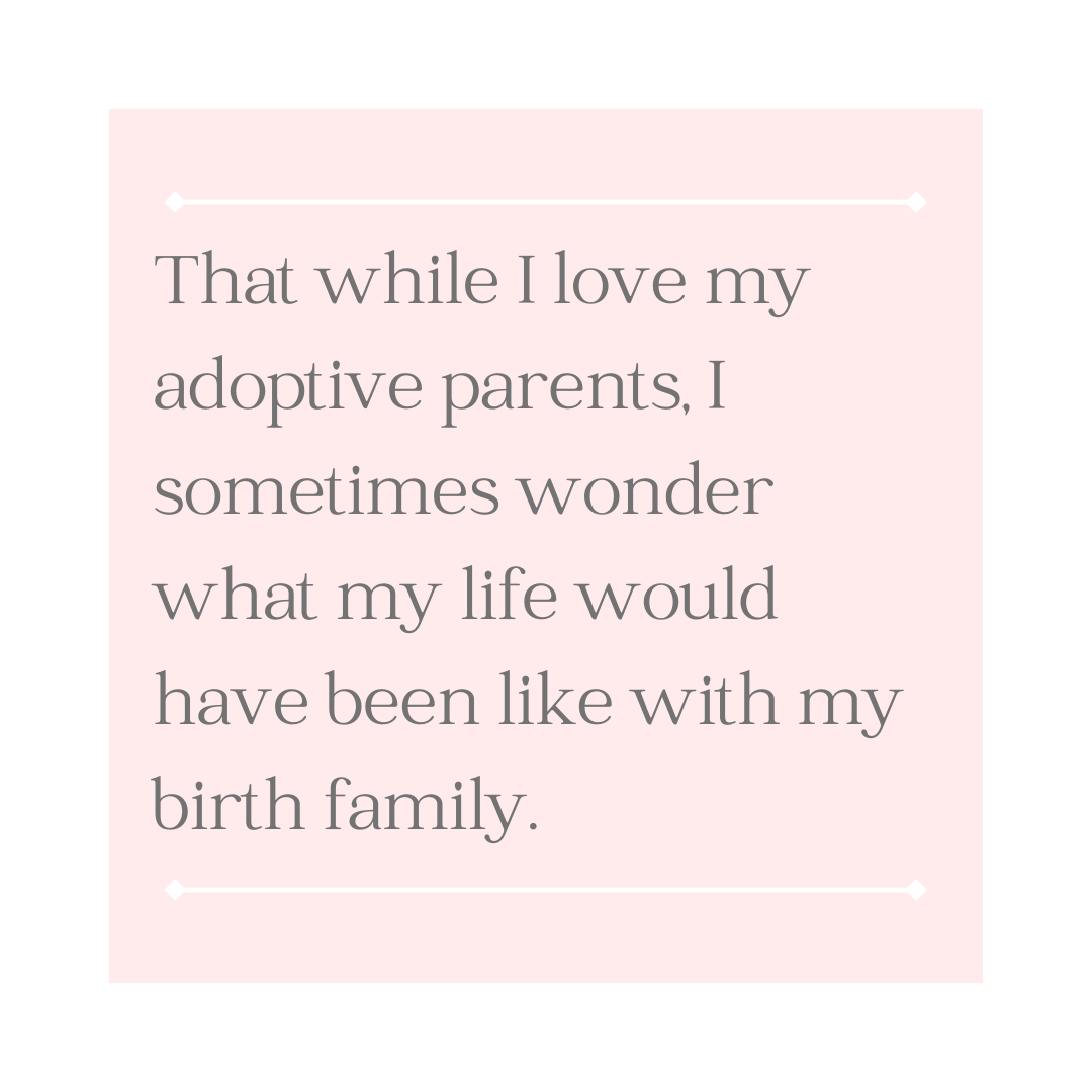 Slide three: White background with a light pink square box. Gray text reads âThat while I love my adoptive parents, I sometimes wonder what my life would have been like with my birth family.â Two white decorative lines appear above and below the text.