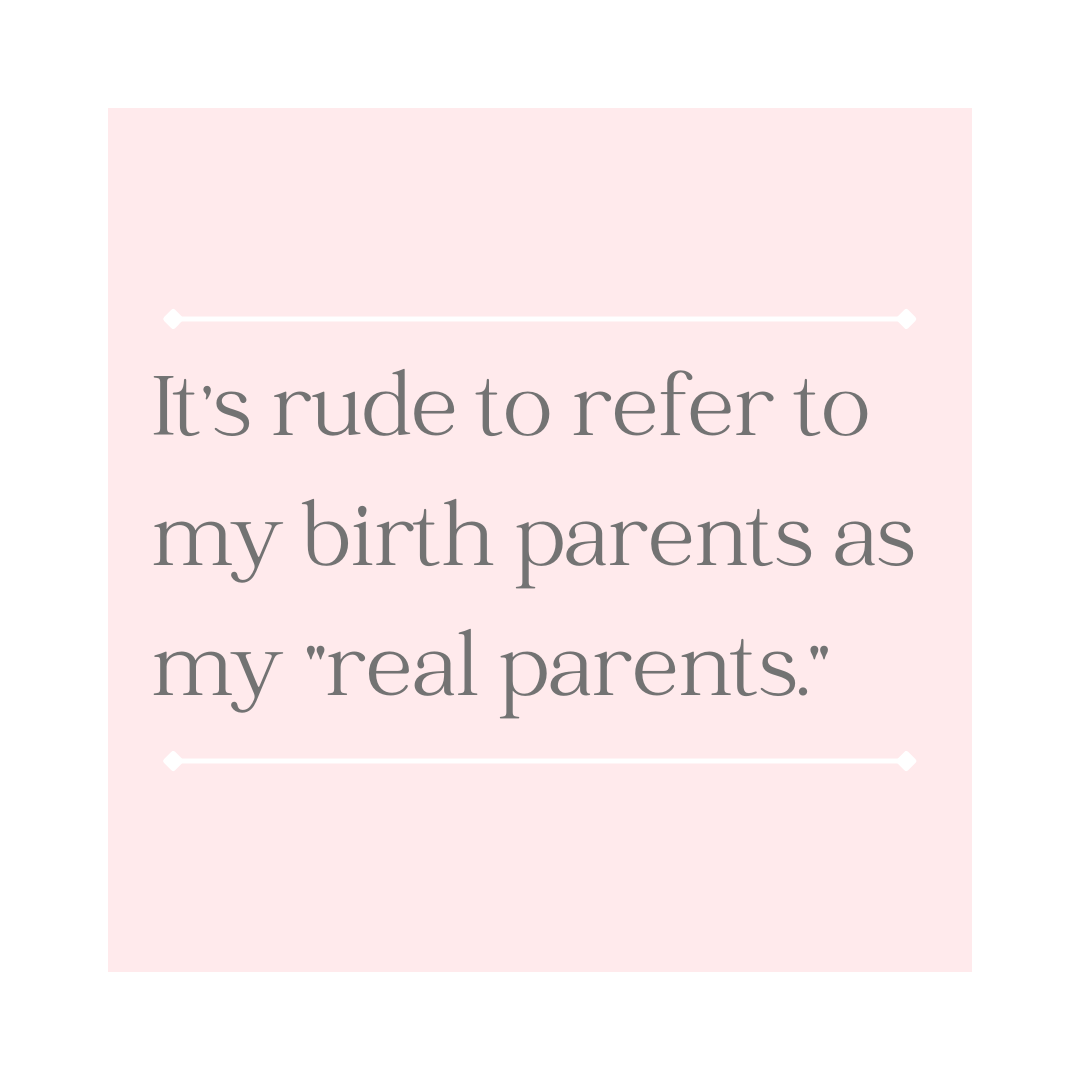Slide five: White background with a light pink square box. Gray text reads âIt's rude to refer to my birth parents as my âreal parents.ââ Two white decorative lines appear above and below the text.