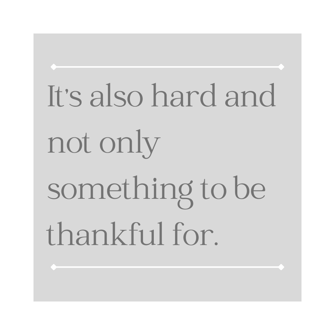 Slide six: White background with a light gray square box. Gray text reads âIt's also hard and not only something to be thankful for.â Two white decorative lines appear above and below the text.