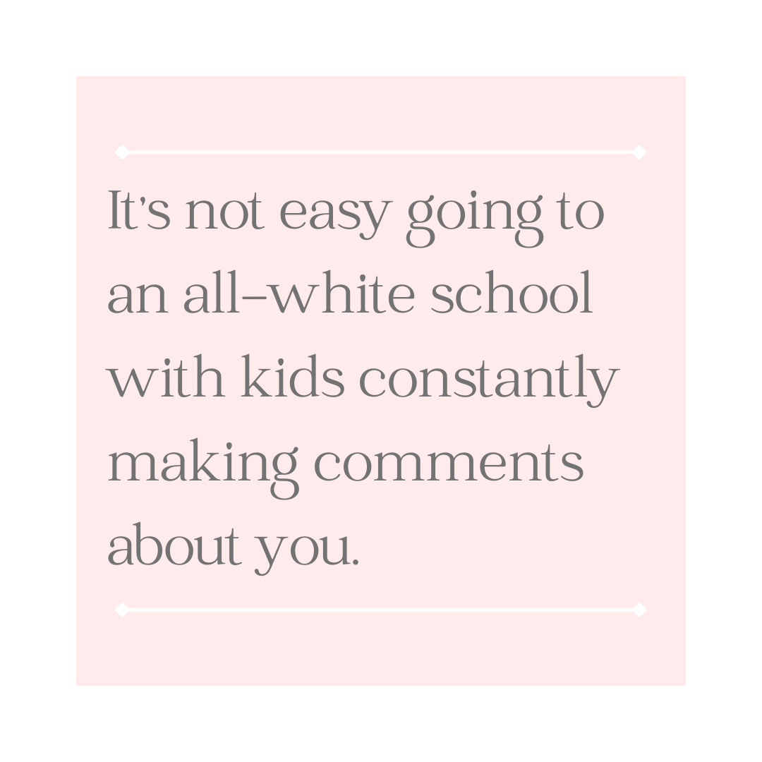Slide seven: White background with a light pink square box. Gray text reads âIt's not easy going to an all-white school with kids constantly making comments about you.â Two white decorative lines appear above and below the text.