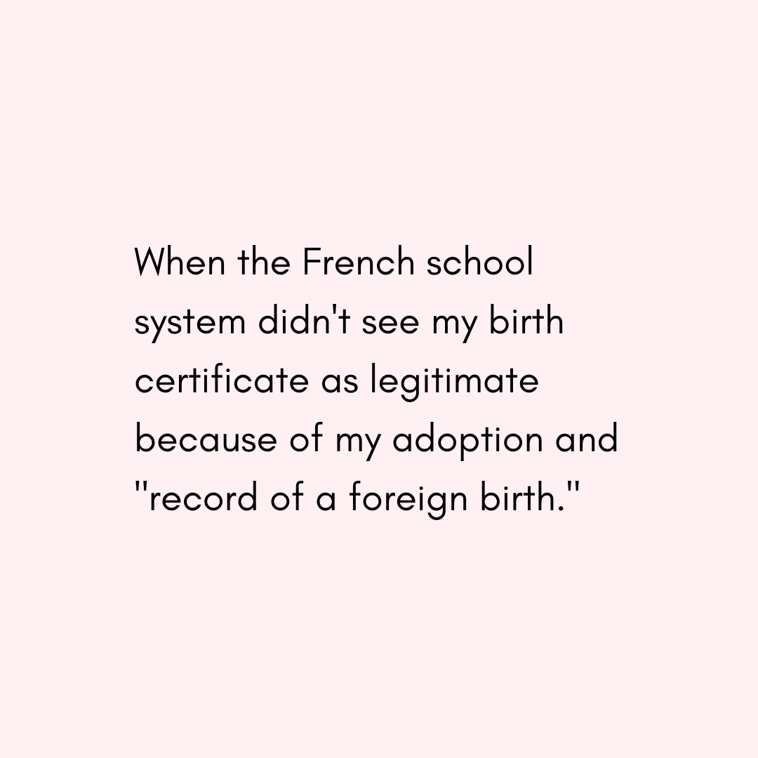 Slide six: When the French school system didn't see my birth certificate as legitimate because of my adoption and a “record of a foreign birth.”