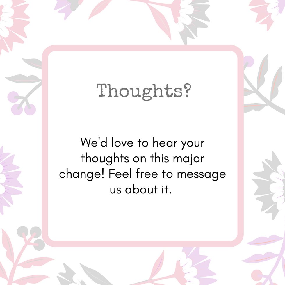 Titled "Thoughts?" Smaller text below: "We'd love to hear your thoughts on this major change! Feel free to message us about it."